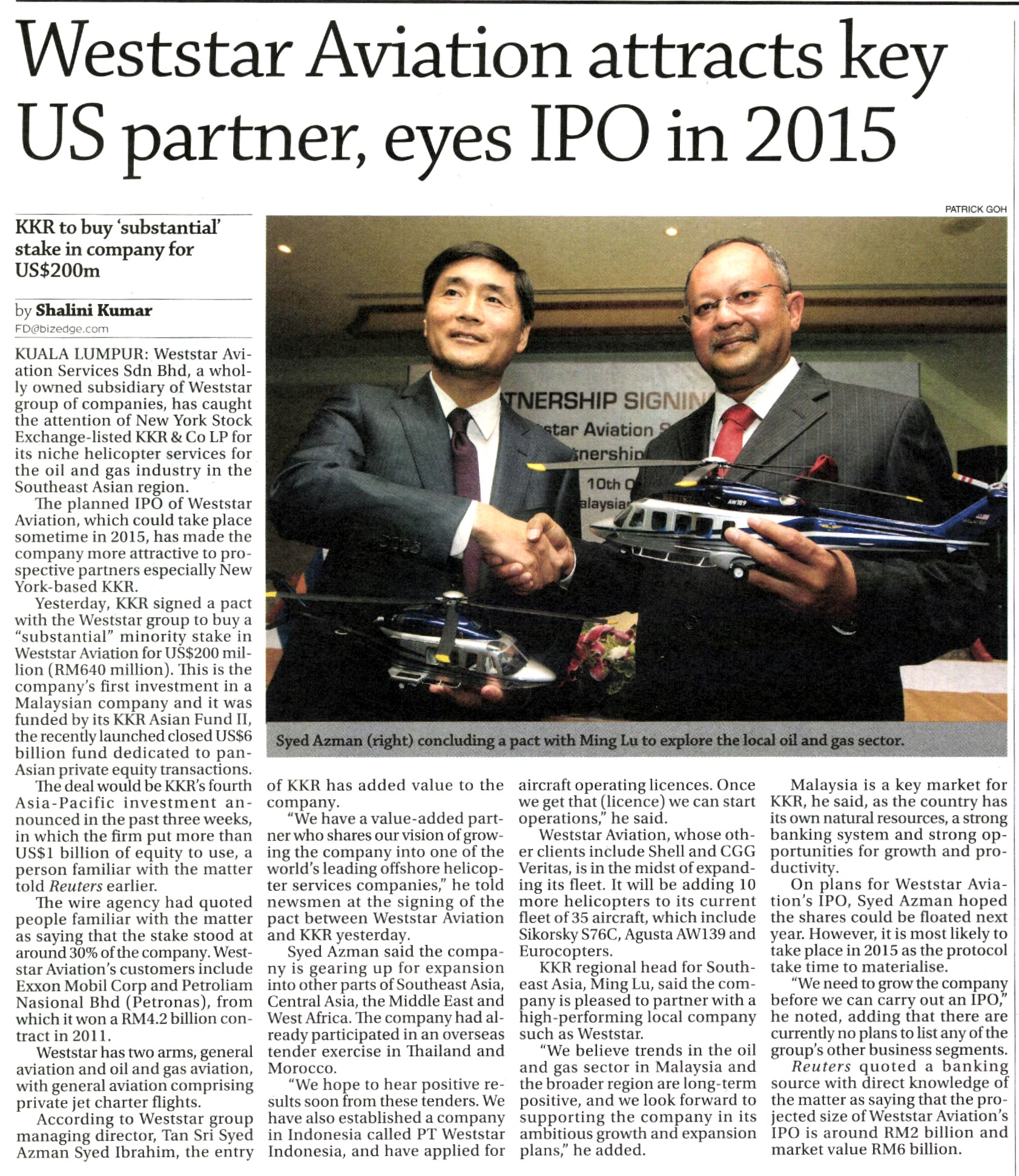 Weststar Aviation attracts key US partner eyes IPO in 2015