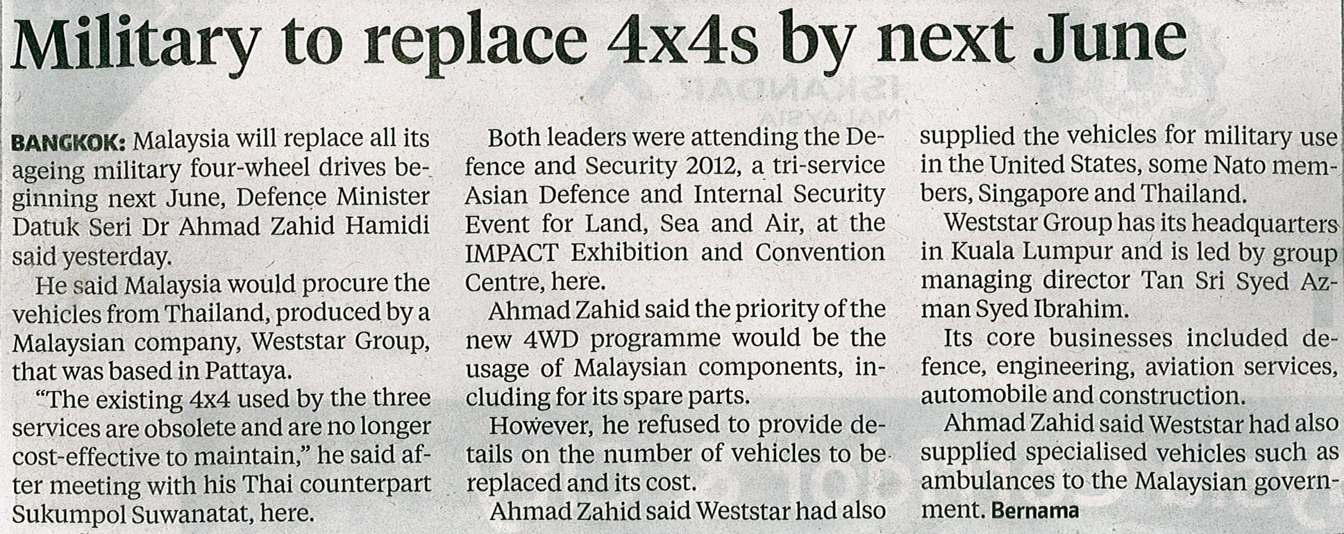Weststar to replace military's 4WDs worth RM500mil